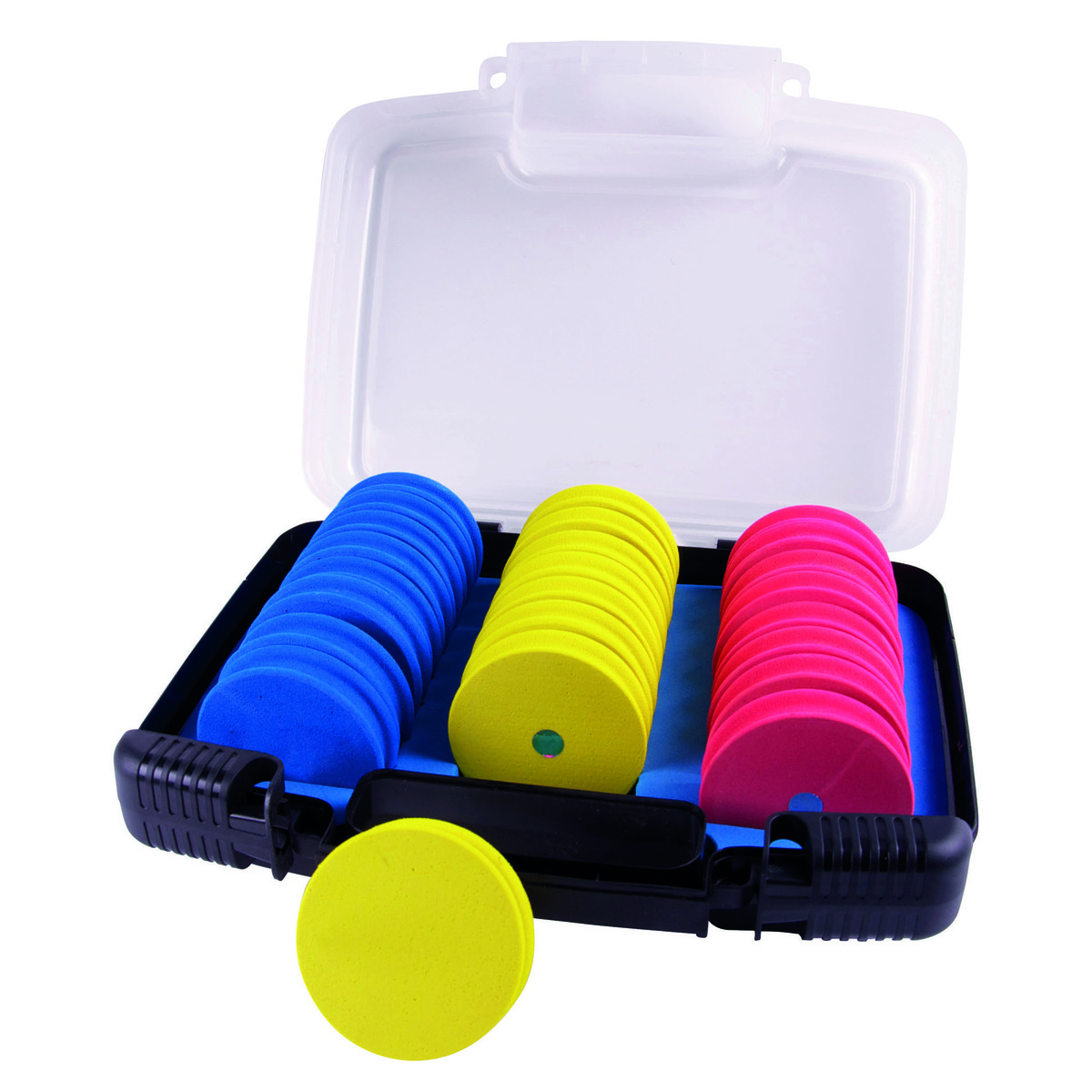 Kuti e përbërë nga 24 tapa të rrumbullakëta të bëra me shkumë të dendur EVA dhe diametër 65 mm. Për të ruajtur të gjitha termianlet tuaja të gatshme për përdorim.
