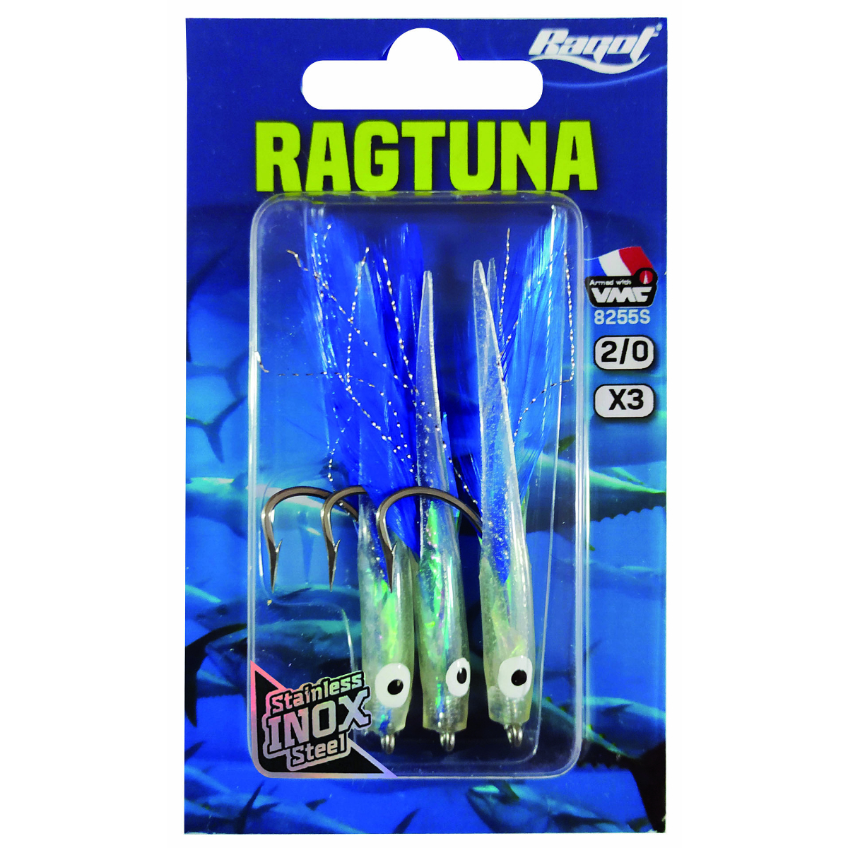 Ragtuna është unike! Imitues për peshkim me trolling e krijuar për të kapur Ton të vogël dhe të gjitha llojet pelagjike, mund të notojë me shumë shpejtësi deri në një shpejtësi shumë të lartë prej 8/9 nyjesh. Kombinimi midis trupit të silikonit dhe pendëve krijon një tërheqje të papërmbajtshme. Koka e prerë krijon turbulencë në sipërfaqen e ujit që tërheq peshq edhe nga ujërat e thella. Grepi prej çeliku inox VMC do t’ju sigurojë që të kapni shumë peshq pa asnjë problem. Ragtuna do të jetë imituesi juaj sekret!